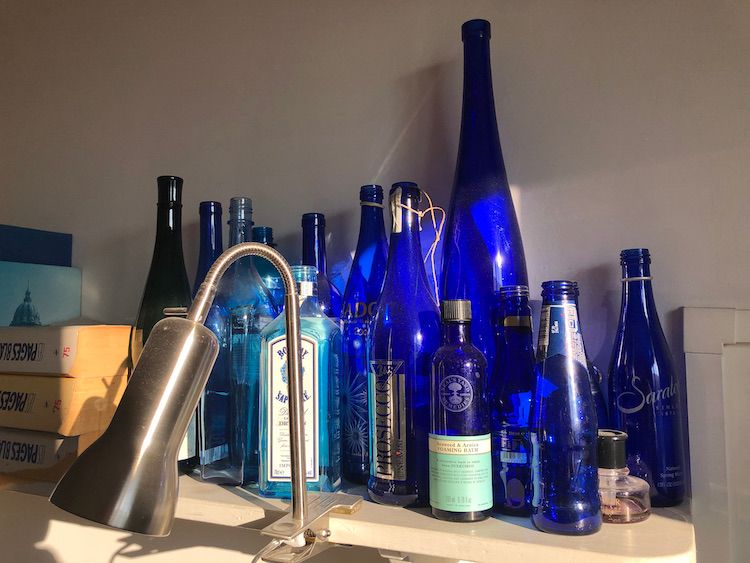 On the other side of the room is my collection of blue bottles, tellingly not enhanced for at least a decade, and the stack of Paris phone books, archeological artefacts that I consult when in need of a fictional name.
