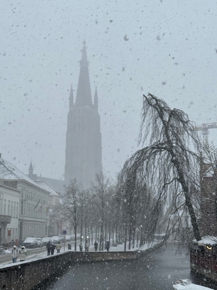 The first stop was the smaller and farther away of the two, Bruges (a Eurostar to Brussels, quick change to a local train, and in less than three hours total we were pulling our suitcases over the slushy cobblestones towards our hotel).