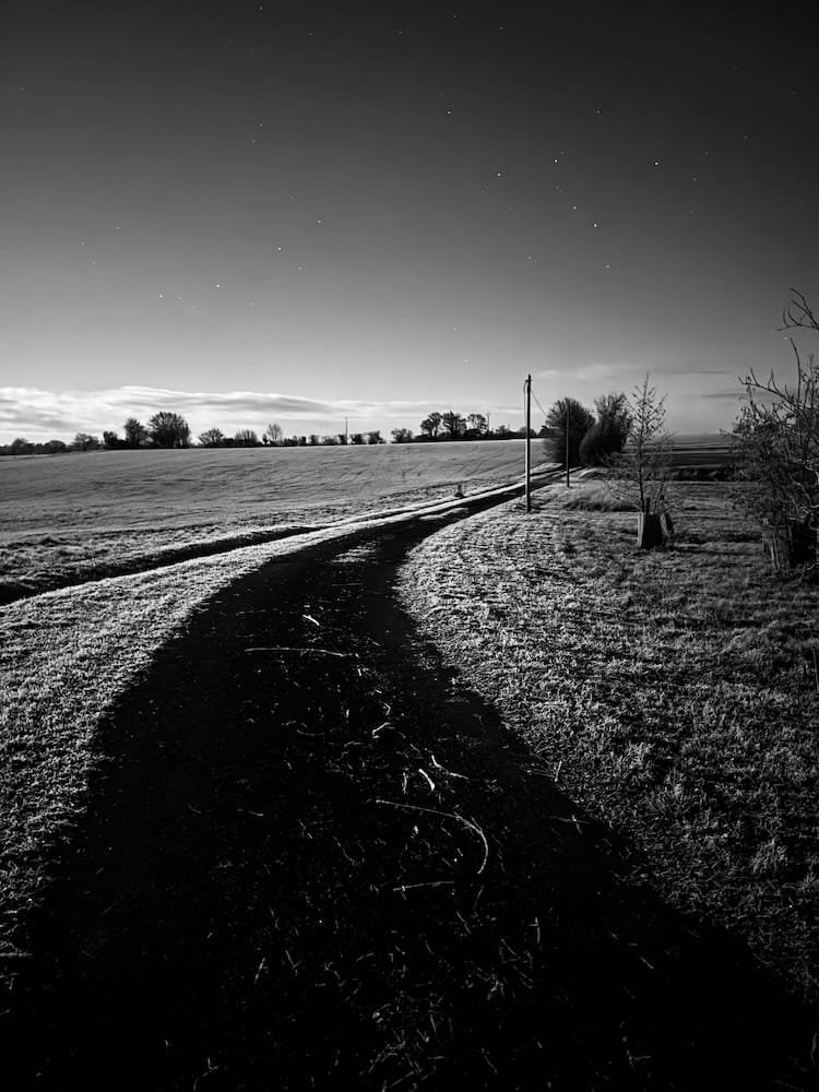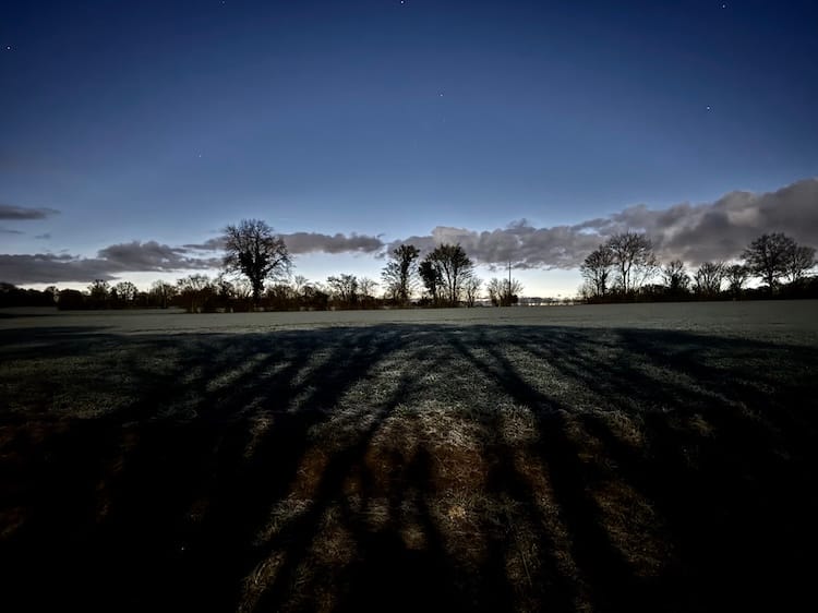 During early morning walks with Tasha, the setting moon (full on the 3rd of January) illuminated our otherwise dark path. The effect on the frosty ground was dramatic and indeed lunar.