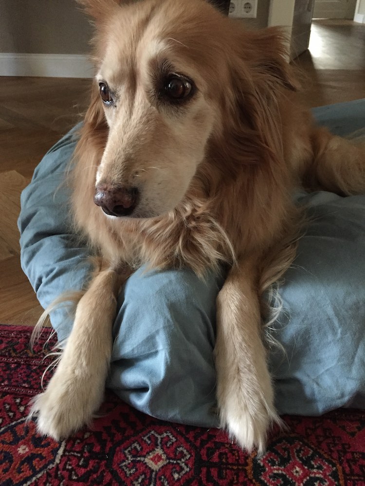 Please do something right away, they said. I am miserable. I cannot wait, not even for David to return from Frankfurt tonight. A couple of calls later, a vet was on her way to the house. Elsa was a lucky dog to the end. She died peacefully and painlessly on her own bed.