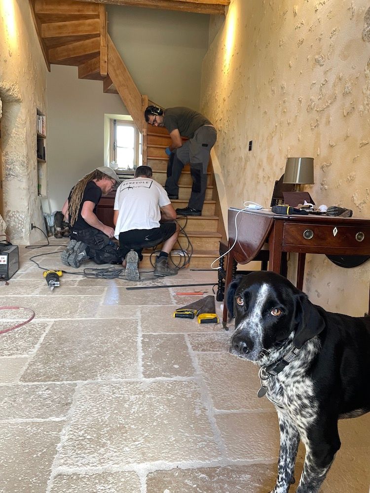 Wednesday morning everyone was back at work, including, coincidentally, the artisans for our residual indoor projects. The carpenters put in shutters to keep out some of the increasingly unbearable summer heat (last weekend the thermometer reached a mind-melting 38°C/100°F, even before it was officially summer). And the metal workers made a new banister for the staircase.