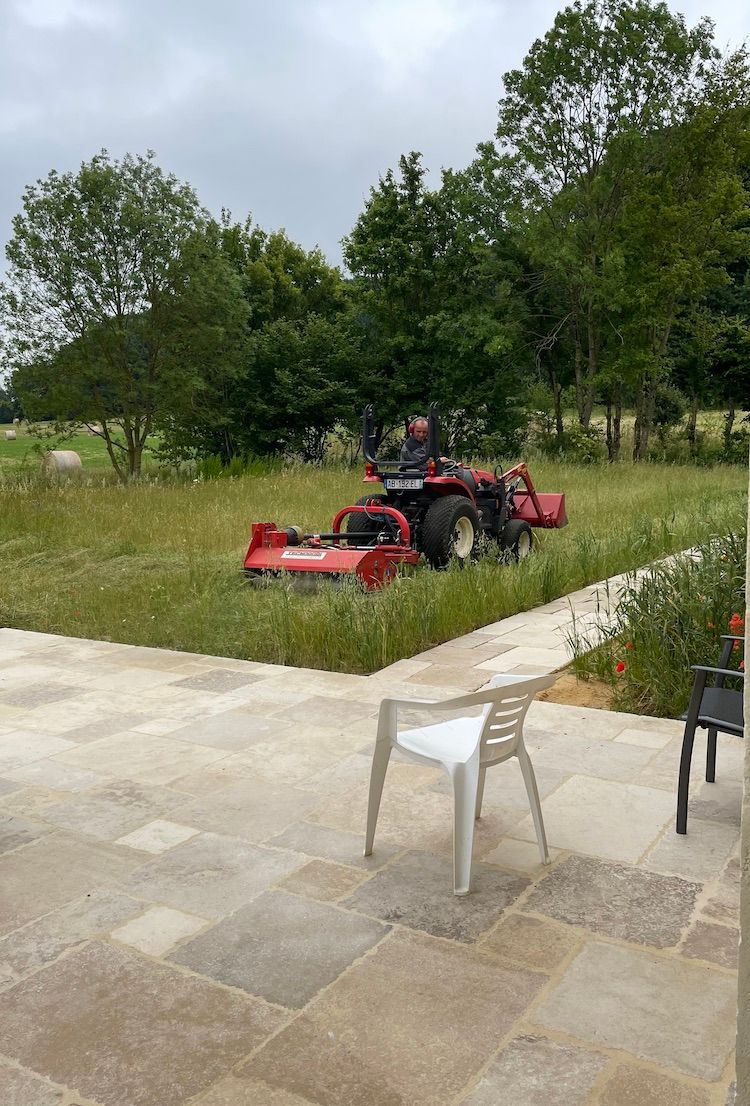 The plan was that while the terraces were being laid in the front of the house, the landscaping and gardening would be done out back. By the time the masons had finished, the terrassiers* could segue to the front and presto, we'd have a finished product, inside and out.