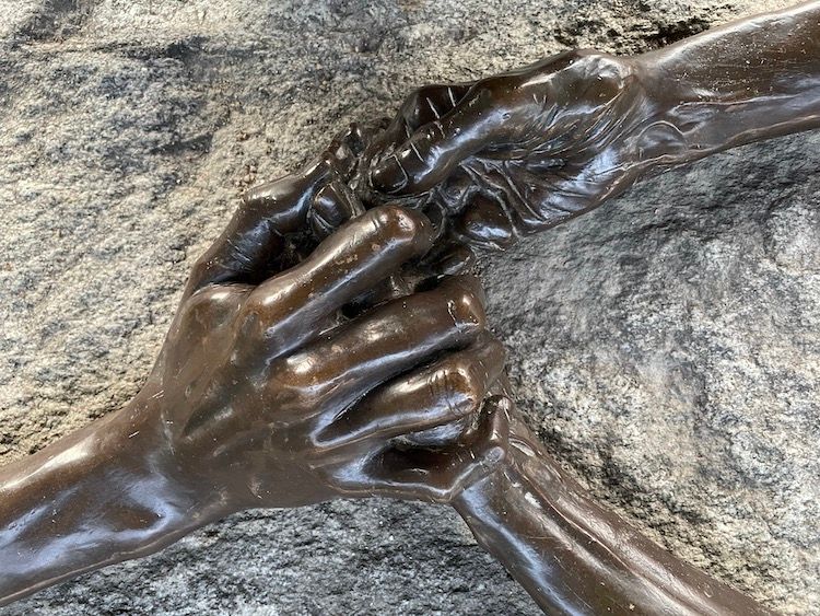 Louise Bourgeois (1911-2010), a French sculptor who settled in New York and an artist I much admire, had three sons. Motherhood was an obsessive theme; many of her works depict woman and child still linked by the umbilical cord because, she would say, the cord is never cut, between you and your mother, between you and your children. The hands are joined, superimposed, intermingled, down the generations. For better or for worse: the arms, after all, are stumps, cut off below the elbow, even at the wrist.