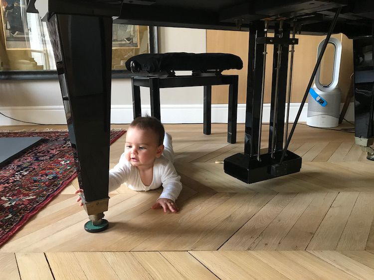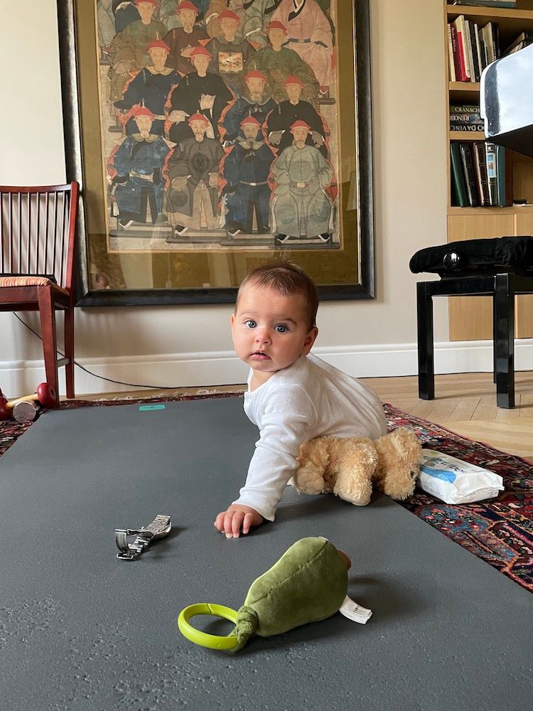 But a blob no more. She is now constantly moving, riveted by everything and everyone around her. On the verge of crawling, she gets up on all fours and rocks, moves one knee forward, before falling back down and rolling to her destination.