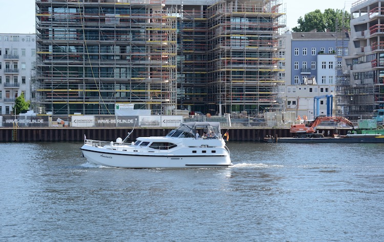 During the GDR period Alt-Treptow, being small and tucked into a corner of East Berlin, was left to languish. By the time we moved here early 2015, our little street near the river had some post-1989 low-rise housing and a couple office towers. Until last week there was also still a large swathe of land on the Spree that had not been touched since cleared of rubble from the bombs that had levelled it (top photo).