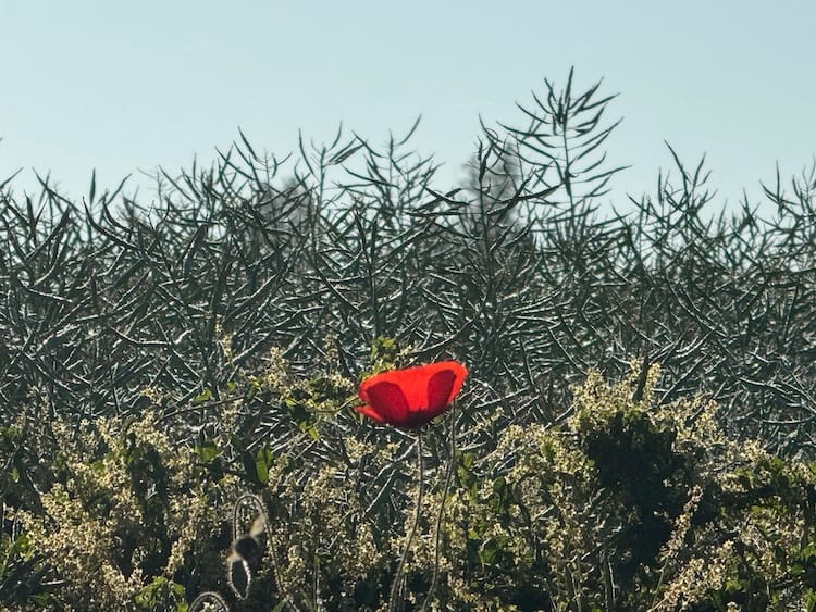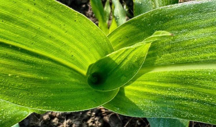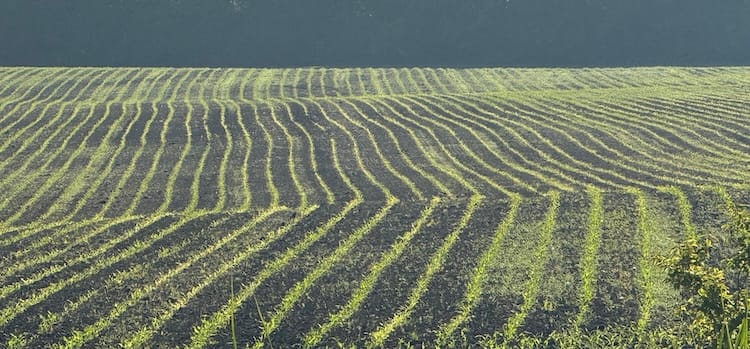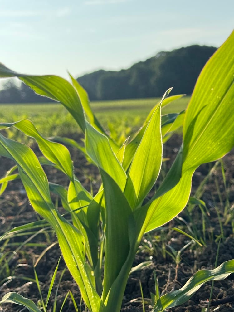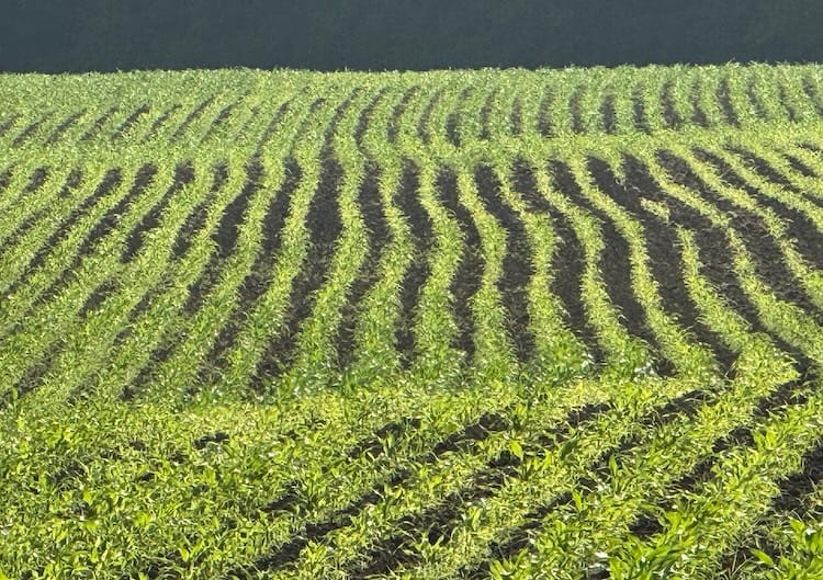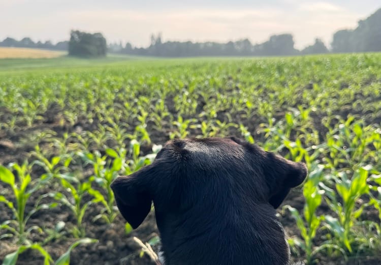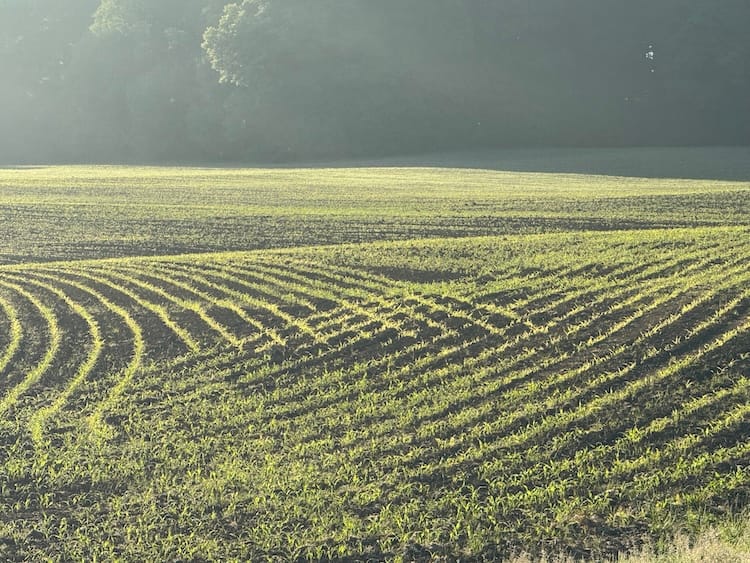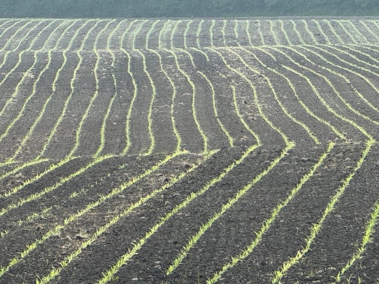 Fortunately, I can watch our corn guilt-free. It's an ancient, multi-coloured variety that will not be fed any chemicals. Unirrigated, it will have to cross its ears and hope for more rain like the heavenly downpour we had last night. As the corn grows, the lines in the field will once again get messy. But such is life.
