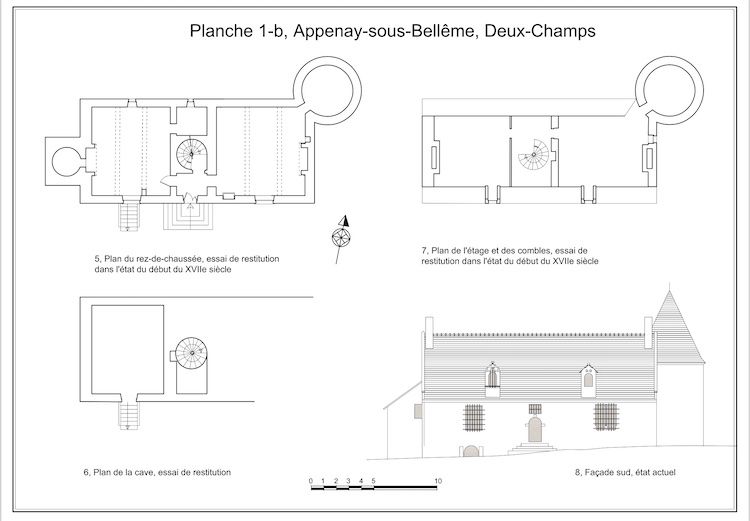 The 19th century changes are marked in red: a couple of windows were added in the living room (the harsh-weather north-face would not have had any in 1588) and the arch to the 'tower' (quite possibly merely a humble latrine) was closed. A storage and furnace room replaced the bread oven behind the kitchen chimney. Upstairs, four small bedrooms and a bathroom were created, probably early 1980s.