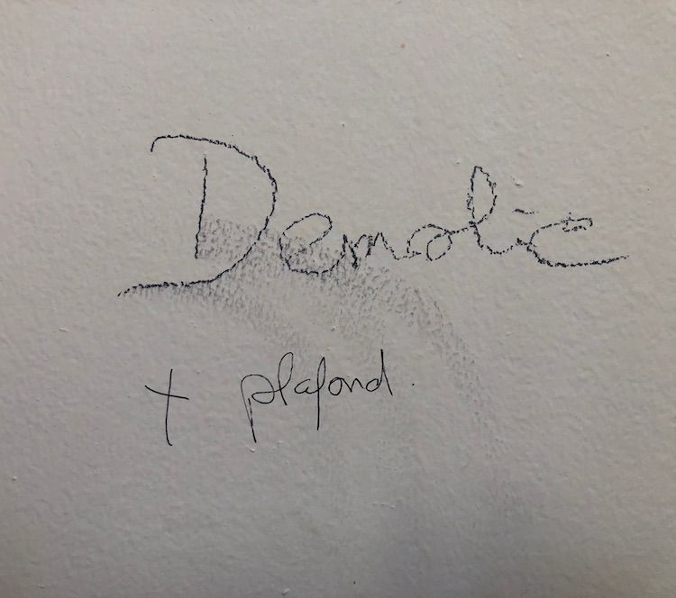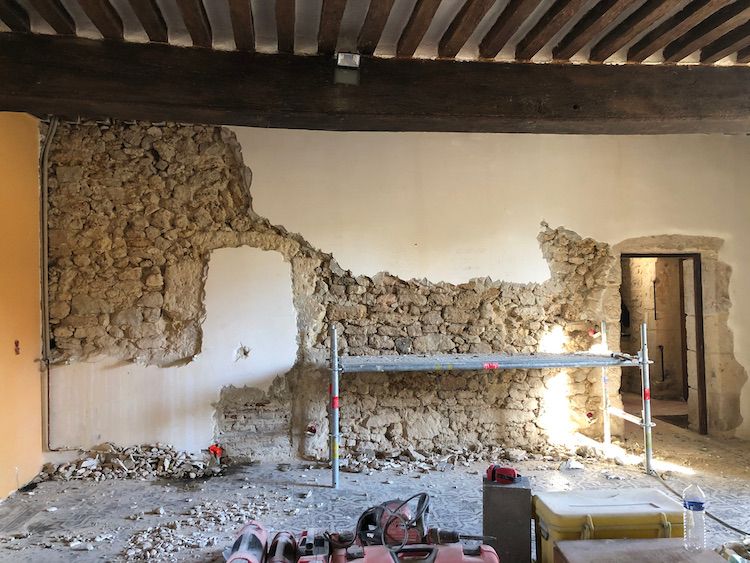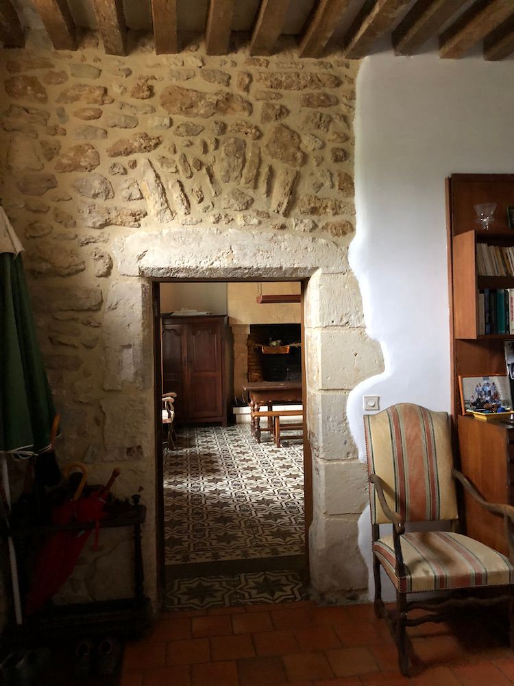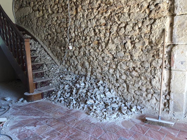 Post-Second World War, it was all the rage in France to cover up old stone (I won’t venture into the psychology of what that might say about the country's dubious conduct during the German Occupation) with newly minted material. Many houses–our former country house being a good example–had a plaster mix called crépi slapped on the exteriors. It was meant to protect from bad weather, but subsequent cracks often trapped rain and created more humidity. In any case, the treatment renders textured surfaces monotone and lifeless, and we removed as much of it as we could from our old mill house in the Eure. Here at Deux Champs the outside stone was spared, but inside some previous owner (the one who removed the stone staircase, I'd bet) smothered the walls of the entry hall and kitchen-dining room with a layer of cement thick as an overly iced cake, finishing off their work with curves I guess meant as aesthetic flourish.