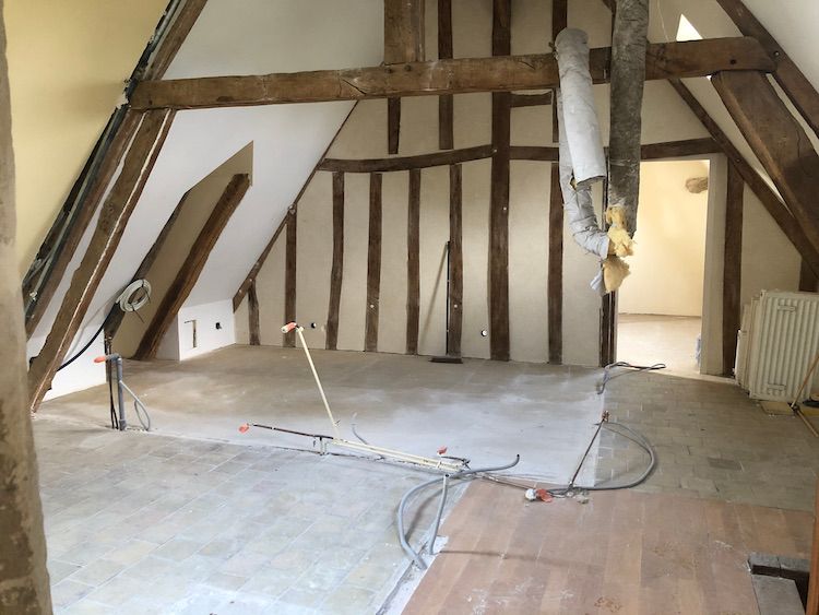 Initially, our architect told us, the massive crossbeams would have stuck up like horse jumps along the tiled surface. The heightened floor would have been added when the space was revamped for human habitation.