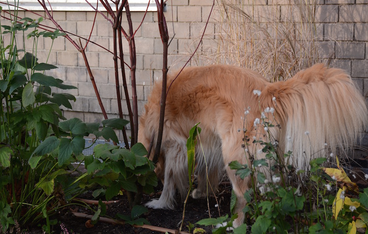 For her age, she remains quite sprightly: she still jumps up and opens doors, dances all over the place at walk time and chases her tail, maybe not every day but several times a week. Much to David’s dismay, she continues to enjoy rooting around his flower beds. With the walnuts either gone or having lost their appeal, she’s developed a hankering for the spring bulbs that were recently planted.