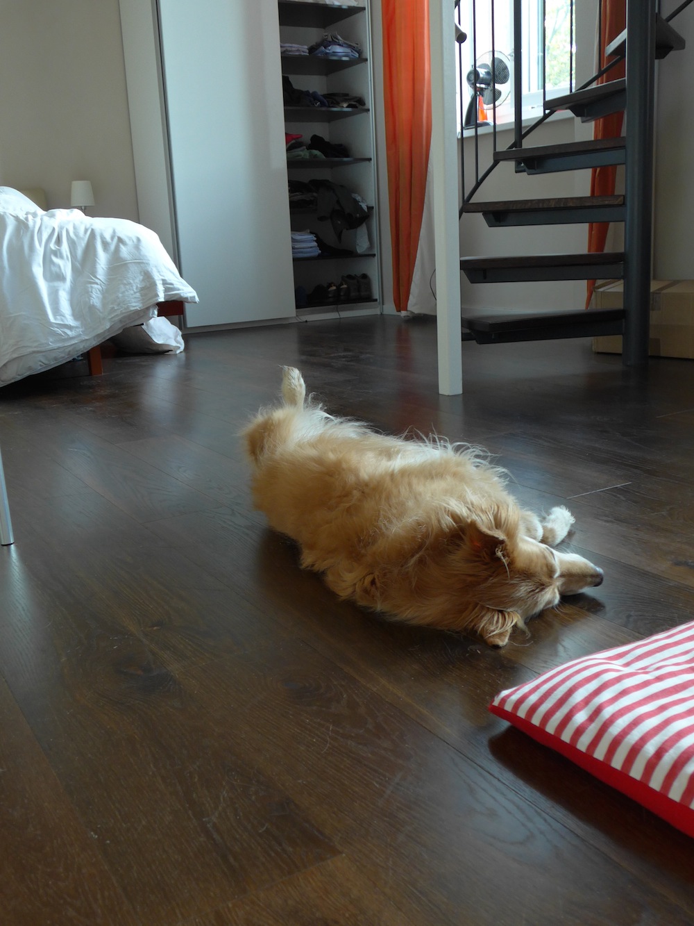 In the new apartment, the slightest excitement (imminent walk, biscuit time) does indeed cause Elsa to slip and slide all over the Parkett but she complains about it a lot less than her owners.