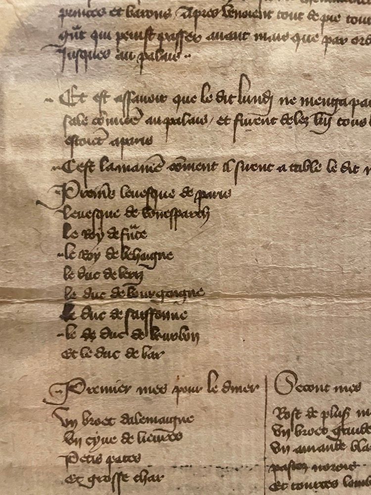 The exhibition begins with an account of a banquet organised in situ in 1378 by King Charles V. The meal for 800 is presented in such enthusiastic and expansive detail, it could have been served yesterday.