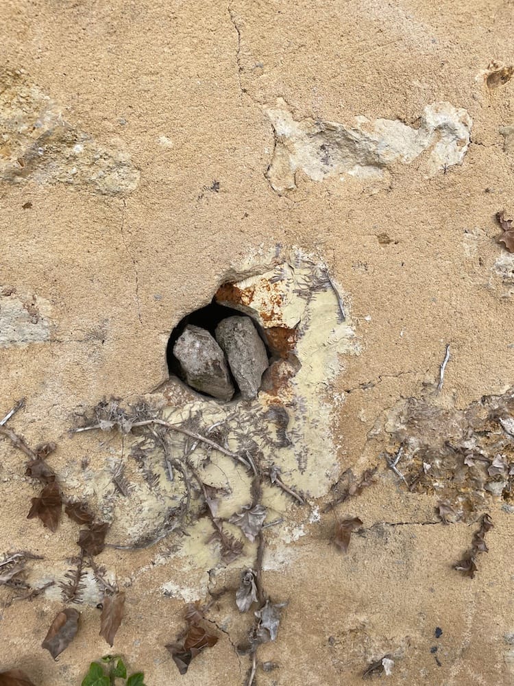 Two tiny tits have made their nest behind some rocks in a hole in the wall of the house where a garden tap used to be.