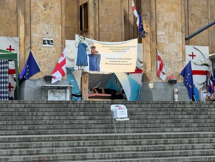 ...that continue to unravel democracy and promote populism (sound familiar?), ever more so since the war began in Ukraine. In 2023-24, the "Law on Transparency of Foreign Influence" requiring NGOs with more than 20% foreign income (David's CNF, for example) to register as "foreign agents" brought tens of thousands into the streets of Tbilisi. But to little avail: since then Georgia has officially suspended its application to join the European Union. Visible opposition has been reduced to this small camp at the Georgian Parliament...