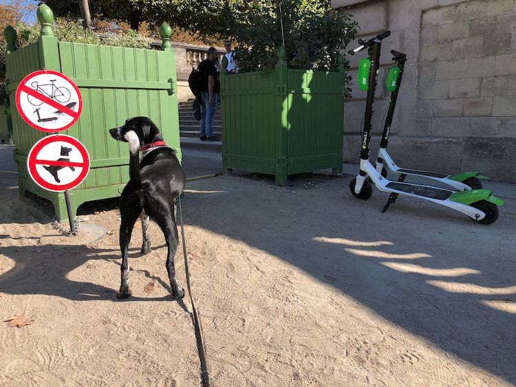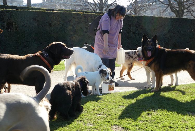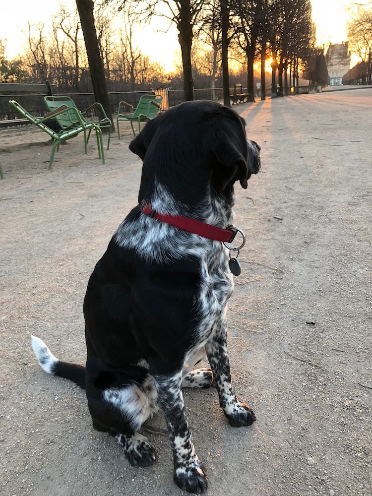 Dogs help you meet a fair sample of Homo Parisus. There are the people with whom you never get beyond a polite hello. There are the troubled ones you should have kept at a distance, the ones who start off with a perfectly nice puppy that they ruin by transferring their own problems onto the dog. And there are those who become friends, fixtures in your life: Nathaële (Youni, Colleen and Mousse), formerly an illustrator of children’s books, now a creator of animated videos; Nelly (Marou and Rêve) who actually worked for the Louvre, upon which the gardens depend, and who constantly defended canine rights for us within the administration; Stéphane (Urfée and Belle), a physical therapist; most recently Juan (Hope), a Cuban-American former antique dealer. And of course Koffi and Virginie (behind Tasha in the above photo), who saved our neurotic rescue dog and my sanity.