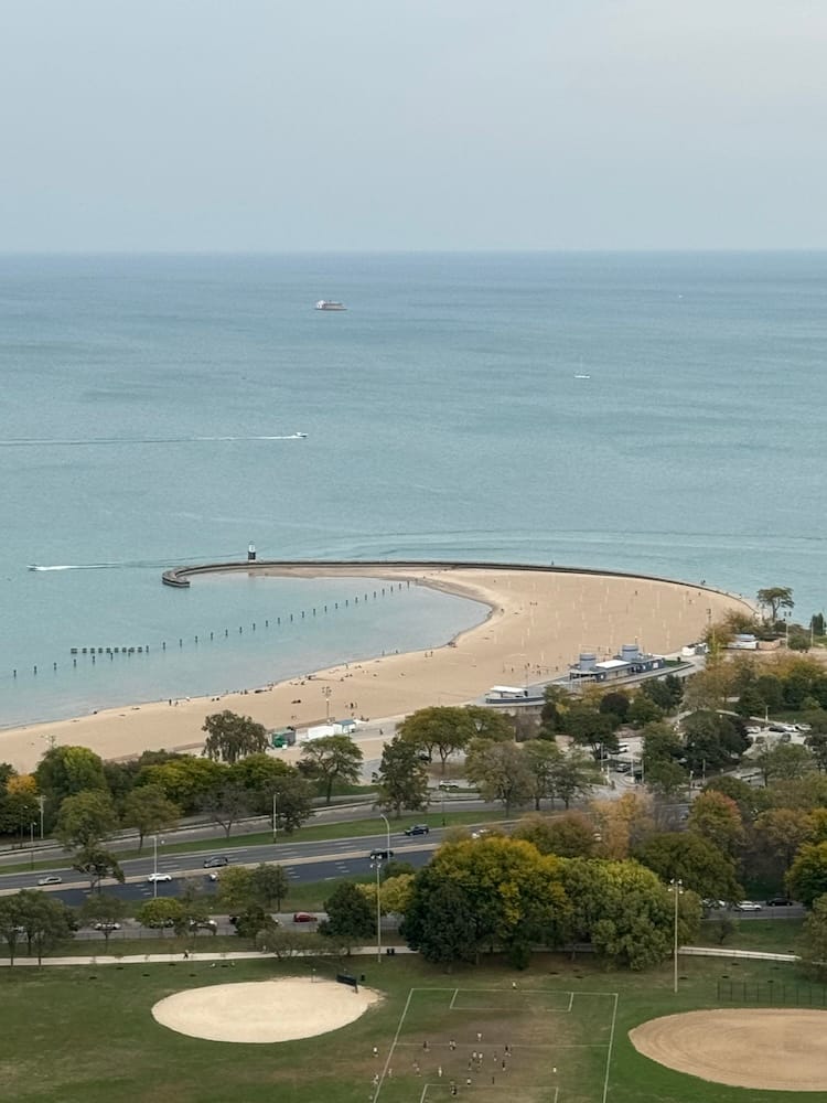 I had friends or schoolmates in three of the surrounding buildings in the above photo; the fourth (right foreground) wasn't there. Every Saturday morning, I'd sit on the window ledge behind the curtains in the living room and look at Lake Michigan (background), watch the traffic on Lake Shore Drive. Later I'd walk or ride my bike down this beach...