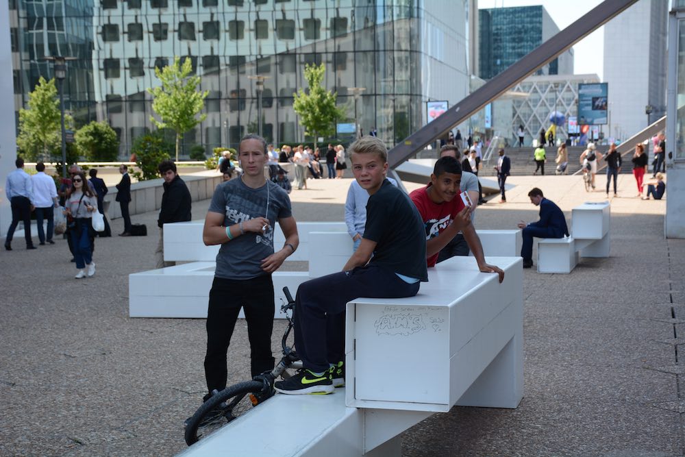 When I visited in the 1980s, there were lots of stained, tired buildings that had not aged well. The silence of the concrete, pedestrian expanses was eerie and the underground shopping mall was downright sinister. I remember being disappointed by la Grande Arche, with all the wires and wind-breaking screen in the middle that ruined its clean lines. And astonished that just beyond the new monument, La Défense just ended, just dropped off into typical Paris suburb.