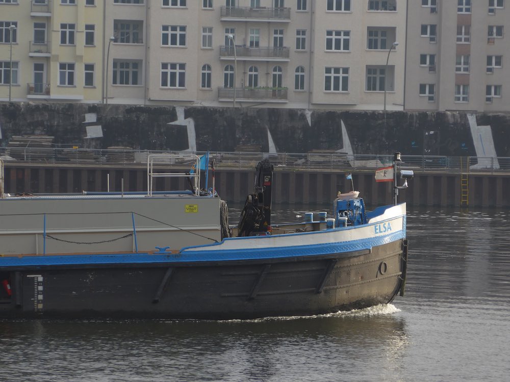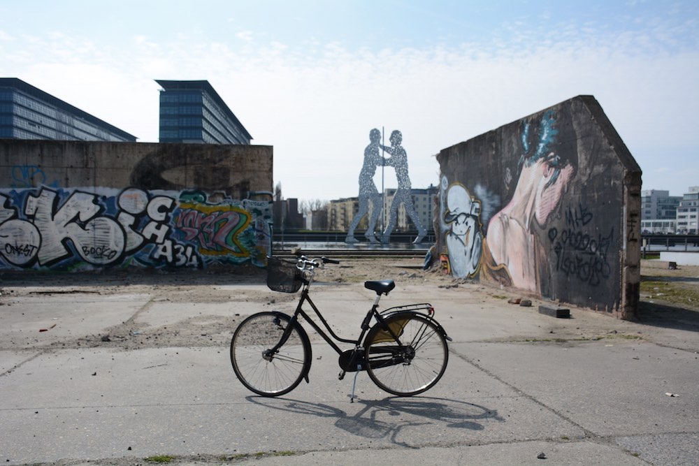 The one I looked at longingly every day while walking Elsa is a remnant of the Berlin Wall across the river (pictured above, beyond the barge). It stretches between new or restored buildings and the Elsenbrücke, the bridge connecting Friedrichshain and Alt-Treptow. Given its prime location, its continued existence is quite likely due to one of the still unsettled property disputes in the former East Berlin. Last week, at a moment when I could no longer stand the mind-numbing hammering, hewing and drilling that is still going on around our building, I rode over there.