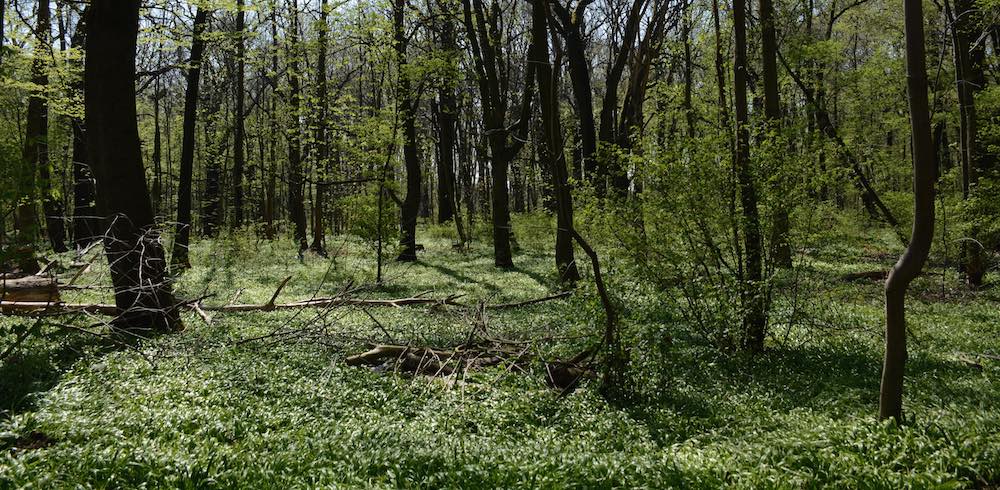 The other day, between the electrician’s departure and the carpenter’s arrival, I rode through the Treptower Park to the wooded area abutting it, Plänterwald, for a closer look. Currently the forest floor is covered in a bed of wild garlic and I am sorry I cannot transmit the heady smell and the sweet birdsong that complete the picture of this little sylvan paradise.