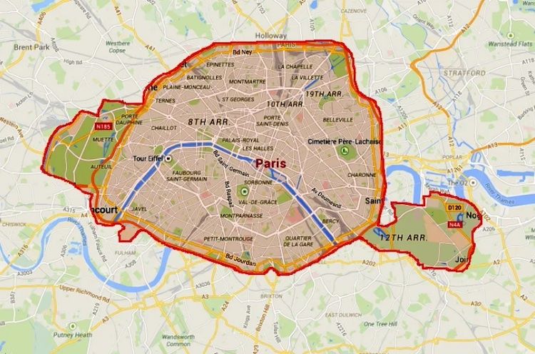 Paris, intramuros, is a tiny city. Ringed by the périphérique, it is 9.5 kms/6 miles north to south and 11 kms/7 miles from east to west. The surface area is 104 square kms/40 square miles. Compared, for example, to London’s, which is 1554 square km/600 square miles. Here is a map that nestles the entire city of Paris into the lap of central London.