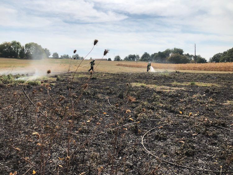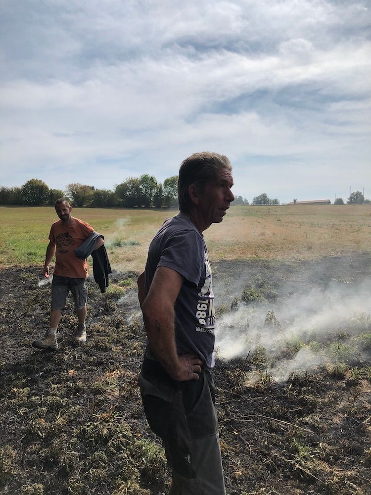 Indeed a large patch of field, right next to the desiccated maize, was burning. Low flames were licking up at the edge of the hedge that rings our garden. At first I couldn’t imagine how the fire had started. Certainly not, as with the El Dorado blaze in California, from 'a pyrotechnic device' set off at a gender-reveal party. Spontaneous combustion from extreme drought? Then I noticed that the electric wires, which usually stretch high above us from one concrete pole to another, were severed and on the ground. The wind, blowing strongly for the umpteenth time these last months, must have finally got the better of a tree in the overgrown hedgerow and caused the cable to snap.