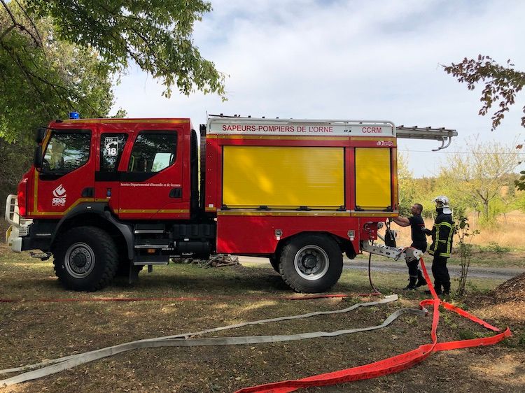 Fortunately the masons returned from lunch. Christophe, le chef, mobilised his two colleagues to wet old sweaters and beat down the areas approaching the corn and the hedgerow. While David drove out to meet the firemen and ensure that they didn't get lost (GPS doesn't always get you here), I soaked some old sheets and supplied The Team.