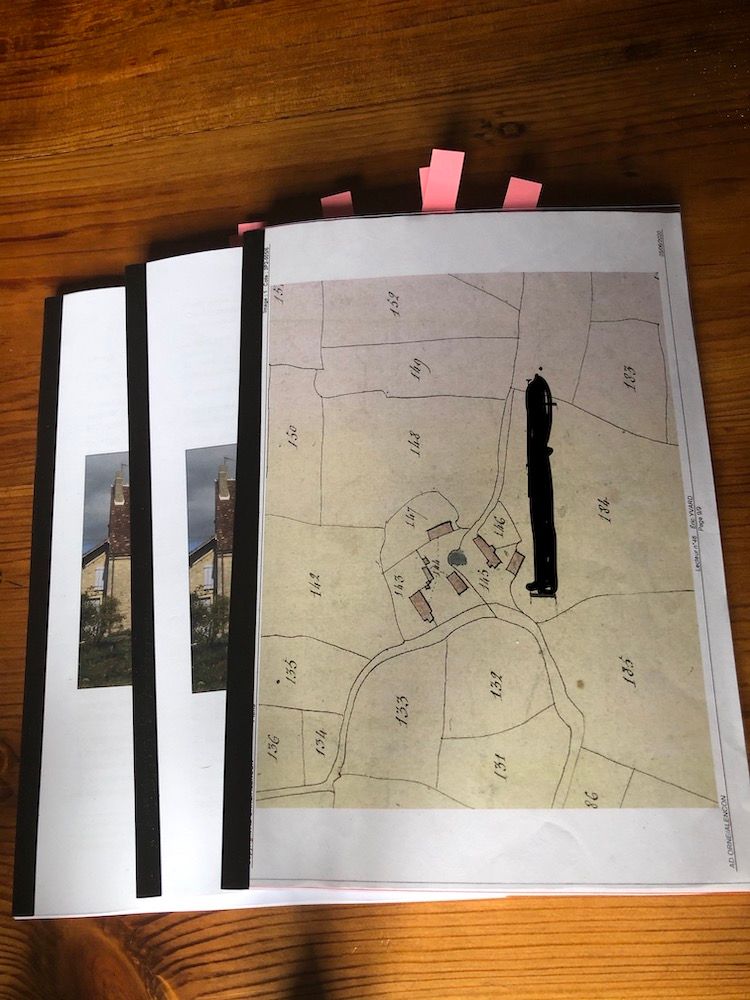 Today began like most second Fridays. I woke up and worked on my blog, walked the dog, ate breakfast and worked more on my blog, this one about progress on our barn reconstruction project, as well our growing knowledge of this place in the Perche that we bought last year. Recently we have had visits from several people who know it well, including the last owner of both house and land. Yesterday the local historian Eric Y returned with his completed three-volume report on this 600-year old property.