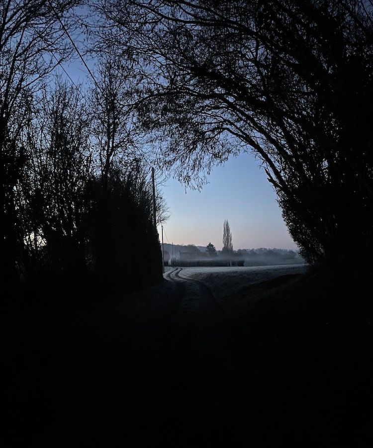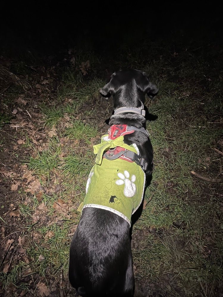 Paris or the Perche, I take Tasha on the same route, in the same 7.30-8.30 time slot, every day. In the Perche, I’m the illuminated one, equipped with a headlamp to help me navigate bumpy, muddy, branch-strewn paths. Tasha replaces her bicycle light (it would not survive even one of her romps through the brush) with a gilet jaune to alert over-eager hunters, should she be led astray into the lighter hours of the morning, that she is not game. A side benefit is that I too can see her, and from quite some distance, even in the penumbra.