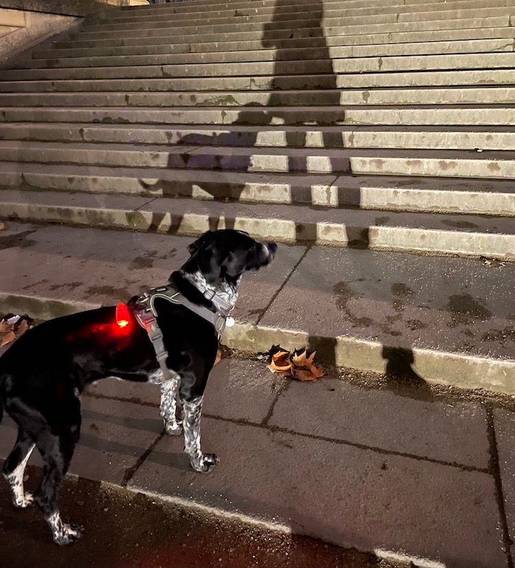 In January, my Paris dog-walking friend Nathaële and I always remark how the days may be getting longer but to all appearances, not in the morning. Beyond the glare of the city lights on the terraces of the Tuileries Gardens, you can’t see a thing, including your own dog, unless she has a flashing red light attached to her harness.
