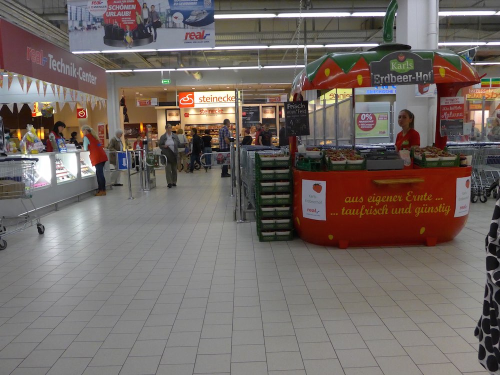 If the cherries are okay, the berries are off the charts. Regular readers may remember my writing about Spargel (asparagus, see GHOST_URL/two-versions-of-spring/). Well the huts are back, in the same places, including at the Real, our local hyper-market, but this time as strawberries.