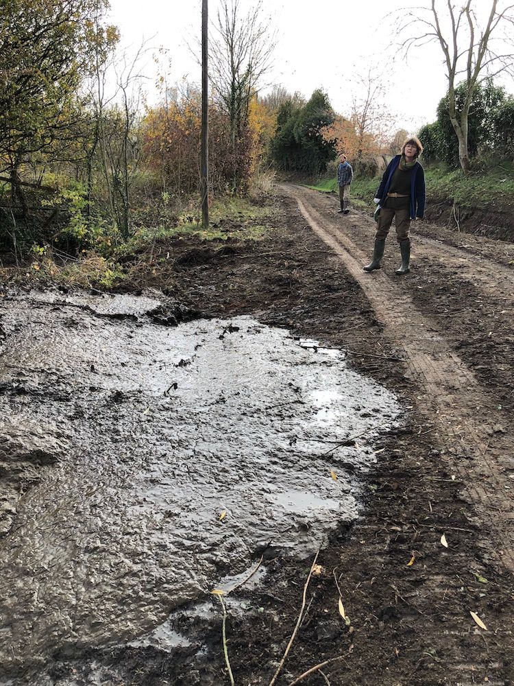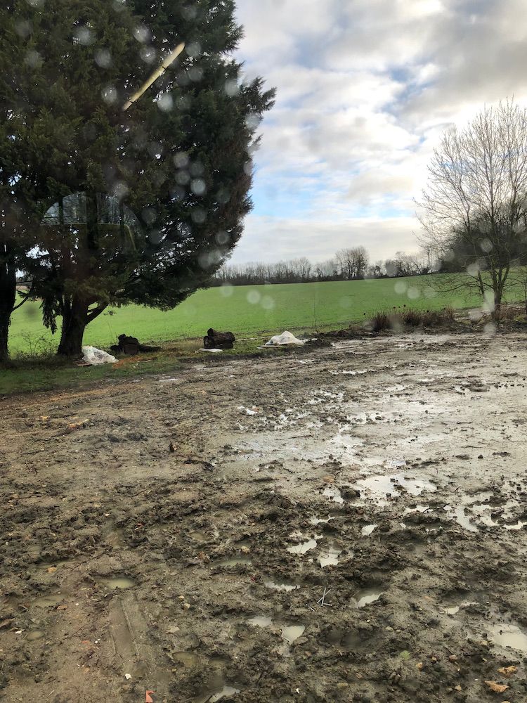 Not so by mid-December. During our two-week absence, much more earth had been overturned and moved in the levelling out back and in the replacement and re-positioning of the septic tank. Plus - key element here - it had rained and rained, and all that clay soil had turned into mud dense enough to rival what gave all those poor soldiers trench foot in 1916. In our first tour of the garden, I sunk thigh-deep into the stuff, perhaps my just deserts for having sniggered at that skid sign in finer weather.