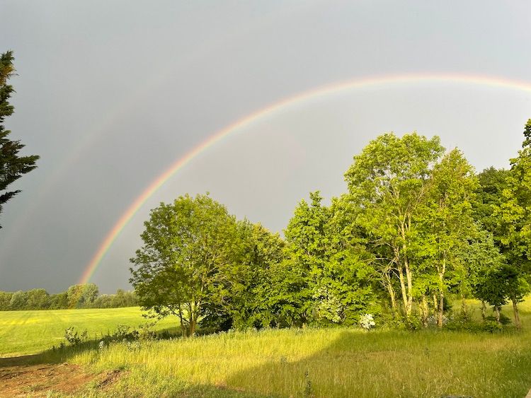 As if to reward my conscious efforts at seizing the day (my "mindfulness," as the book might have said), the heavens surprised us last Wednesday evening and dumped buckets of water on the earth. The downpour worked on me like a muscle relaxant. And as if to make doubly sure that I got the message, rainbows - the incarnation of salutary ephemera - appeared on the horizon.