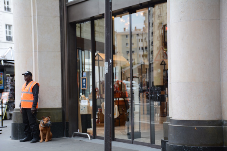 Meanwhile, the threat of another terrorist attack lingers in the air, is brought to mind at the entrances to stores and public buildings.
