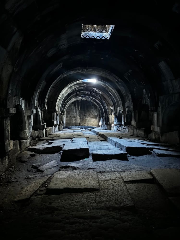 Its history stretches back a long way. Crude stone tools from one million years ago have been found on the highlands. In the Areni-1 Birds' Cave, which we visited, the world's oldest leather shoe (c 3500 BCE) was unearthed in 2011, along with baskets, clothes remnants and clay vessels. Armenia contests its northern neighbour Georgia's claim to being the earliest wine producer (an "our amphorae are older than yours" spat). There is no doubt, however, that Armenia became the first country to adopt Christianity as the state religion in 301 AD, a full 12 years before Constantine, and it has 4000 monasteries and churches to prove it. Some have been left to the elements…