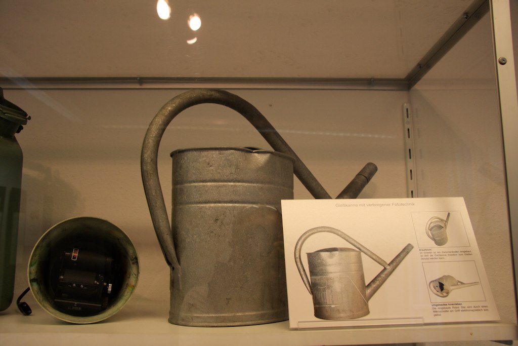 The most astonishing part of the exhibit is the spy tools. Little cameras that were concealed in neckties, behind coat buttons, in a log. There was even a watering can, with a camera in the false bottom, presumably so that spies could pretend to be watering graves while they photographed grieving families and friends.