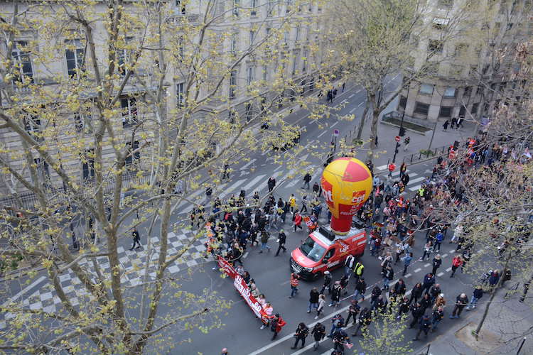 Generally, these manifestations begin as festive affairs. At the departure point, there are stands selling food and drink. Different union chapters set off - yesterday right underneath our window...