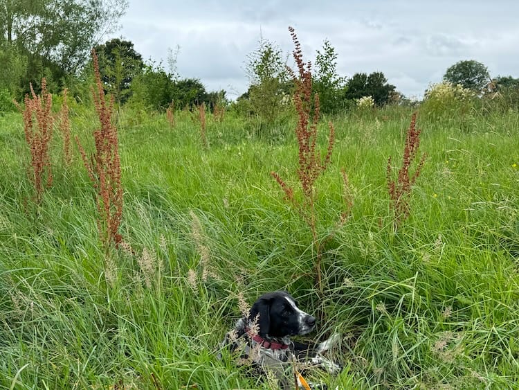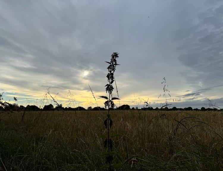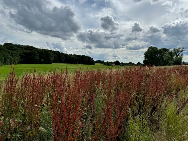 Birds now share the airwaves with bees who buzz around the blackberry flowers at face level, while underfoot the thick, tall grass, still being watered regularly by rain, conceals ruts and bumps left from the passage of tractors, quads (scourge of the countryside) and horse hoofs. It would be easy to sprain an ankle.