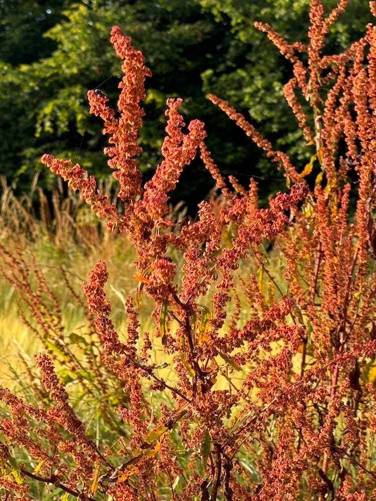 Should you be thinking the russet flora might pleasingly offset the surrounding green in your life, think again. Rumex obtusifolius , otherwise known as dock weed, is an obstinate pest (rumex was the name that the Roman naturalist Pliny gave to sorrel and obtusifolius means obtuse-leaves, for their shape rather than their level of intelligence). Though the leaves are sorrel-like and edible, this invasive interloper has a taproot that descends all the way to Middle Earth. Each plant produces a gazillion seeds that can survive in the soil for up to 50 years. Before you know it, you've gone from nuclear family to metropolis.