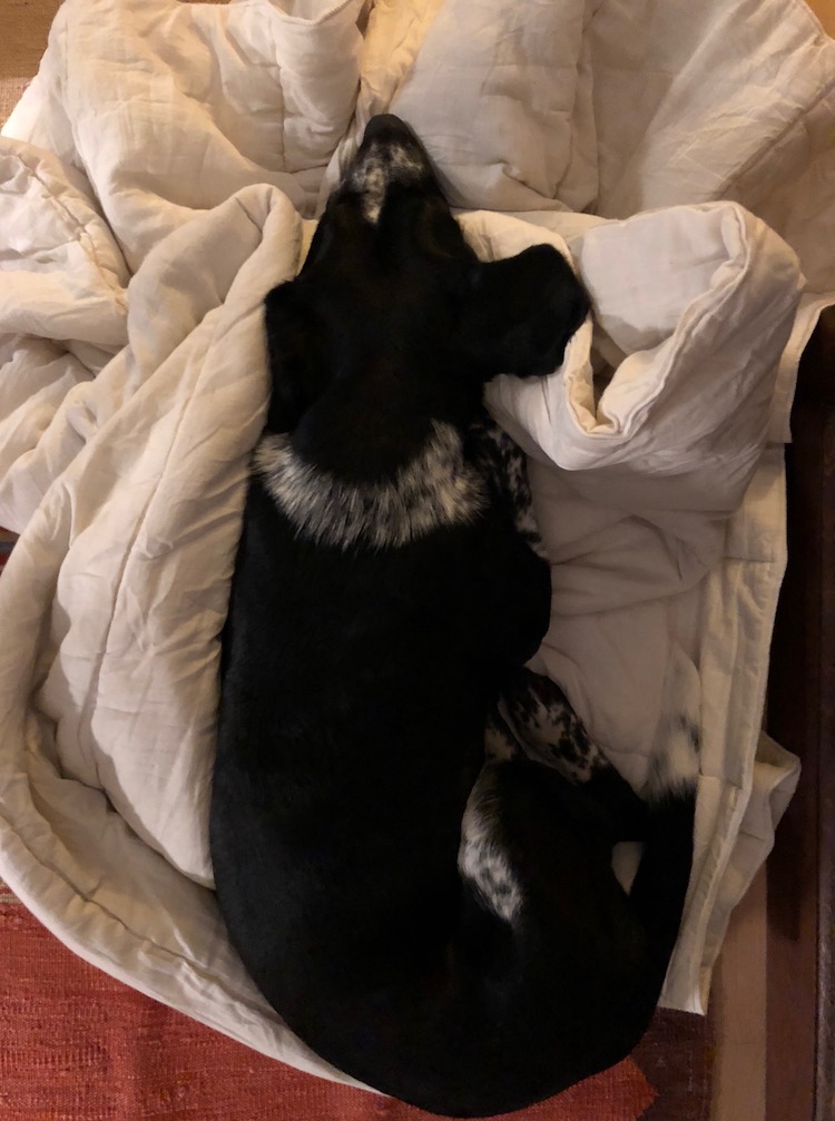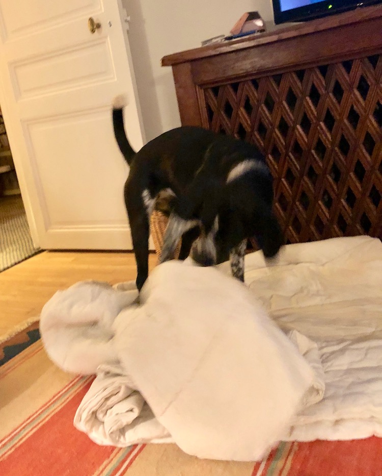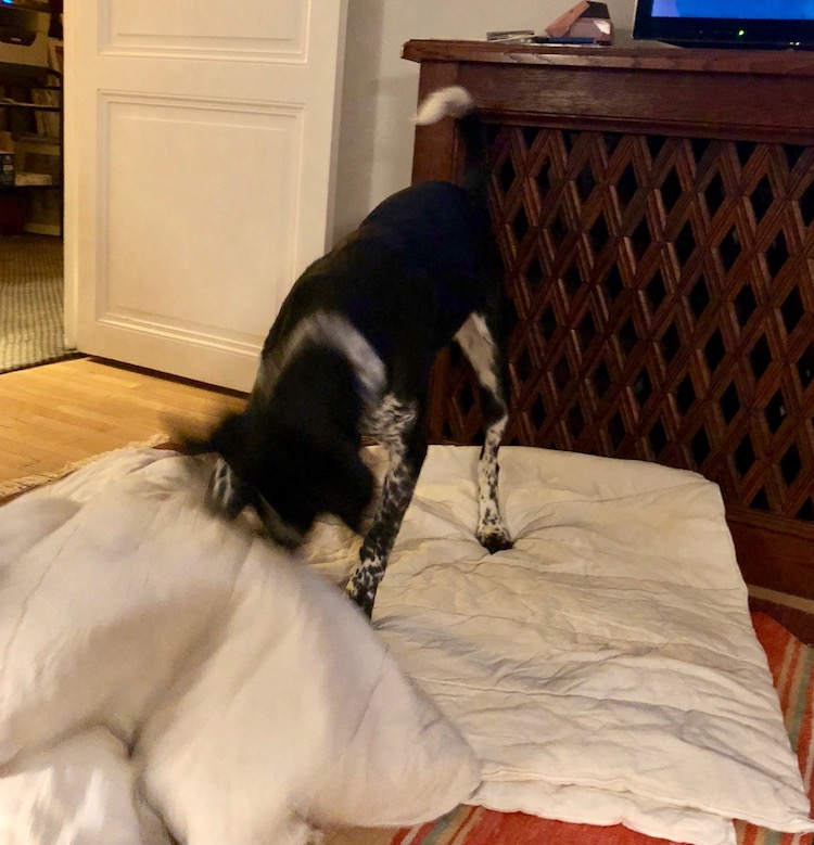 This got me thinking about her comportment in general. Most of the time Tasha refuses to sleep on the floor. She needs not just a bed but a bed with a blanket that she can rearrange with her paws and teeth to her liking.