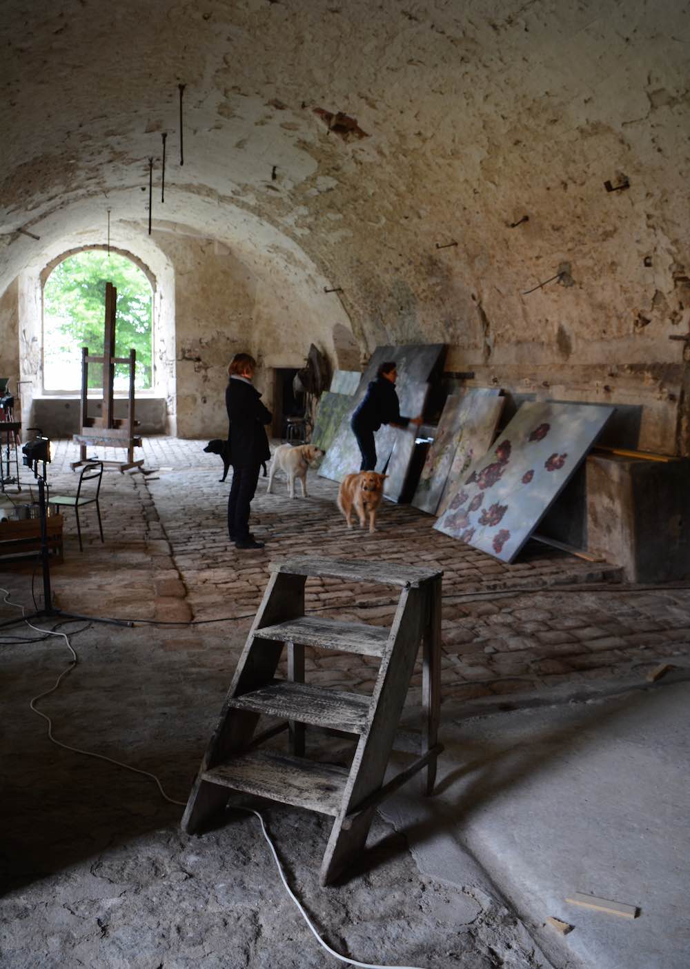 that had been boarded up by some previous owner to make stables of of the space, thus blocking both the light and a sweeping view over the valley below. Here you see Claire preparing for an exhibition (portes-ouvertes) taking place this weekend and next.