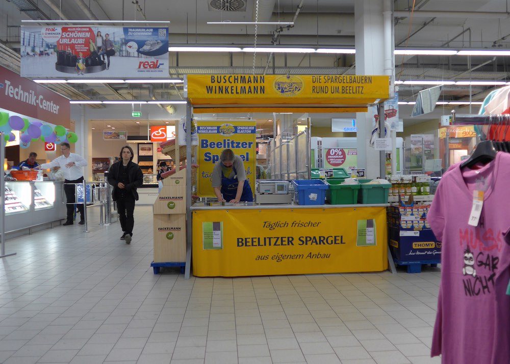 Around Berlin, the good white asparagus is from Beelitz, about 20 kms south of Berlin, near Potsdam. It is, as advertised above, "fresh daily from our own farm" and available in several different calibres at varying prices. I could not bring myself to buy it between the t-shirts and the Technik-Center in the Real but I did purchase some twice from a hut on the Karl-Liebnechtstrasse next to the Alexanderplatz and once from a hut in front of the mammoth DIY store Hellweg in Friedrichshain. It was all delicious and indeed very fresh.