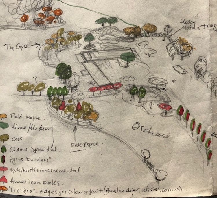 We had been warned. Claire, our green guru, was keeping us up-to-date on developments: the new driveway and parking area, the foundations for a terrace out back. She had sent us a drawing of what she planned to plant and where...