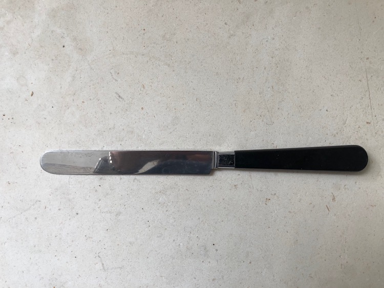 Finally I managed to open a lower cabinet with my foot, which in turn allowed me to slide open a drawer from underneath with my hand and get some utensils. With this knife I was able to pry open enough cupboards for us to eat and drink: