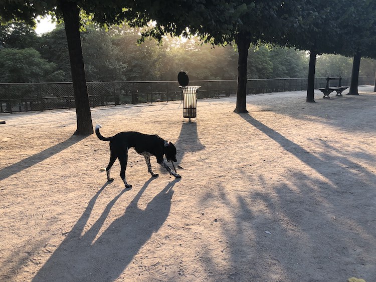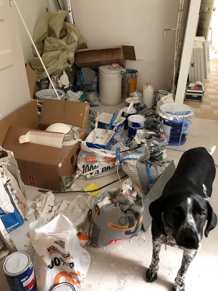 II. Tasha is good too. As I wrote last month, she stayed with her trainer-shrink-yoga teacher Anna when we went to Georgia for 12 days and her improved behaviour since approaches the realm of miracle. Somehow here in Paris, where I’ve been walking her without a lead almost everywhere, it’s particularly apparent. And as you may be able to tell from the above photo, she is coping with the work site better than either of her owners.